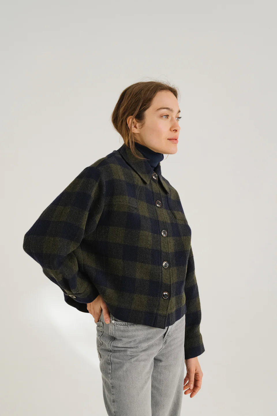 Veste courte ample coton et laine, non doublée, col classique, pas de poche, emmanchures basses, poignets larges boutonnés. Empiècement et plis dans le dos.