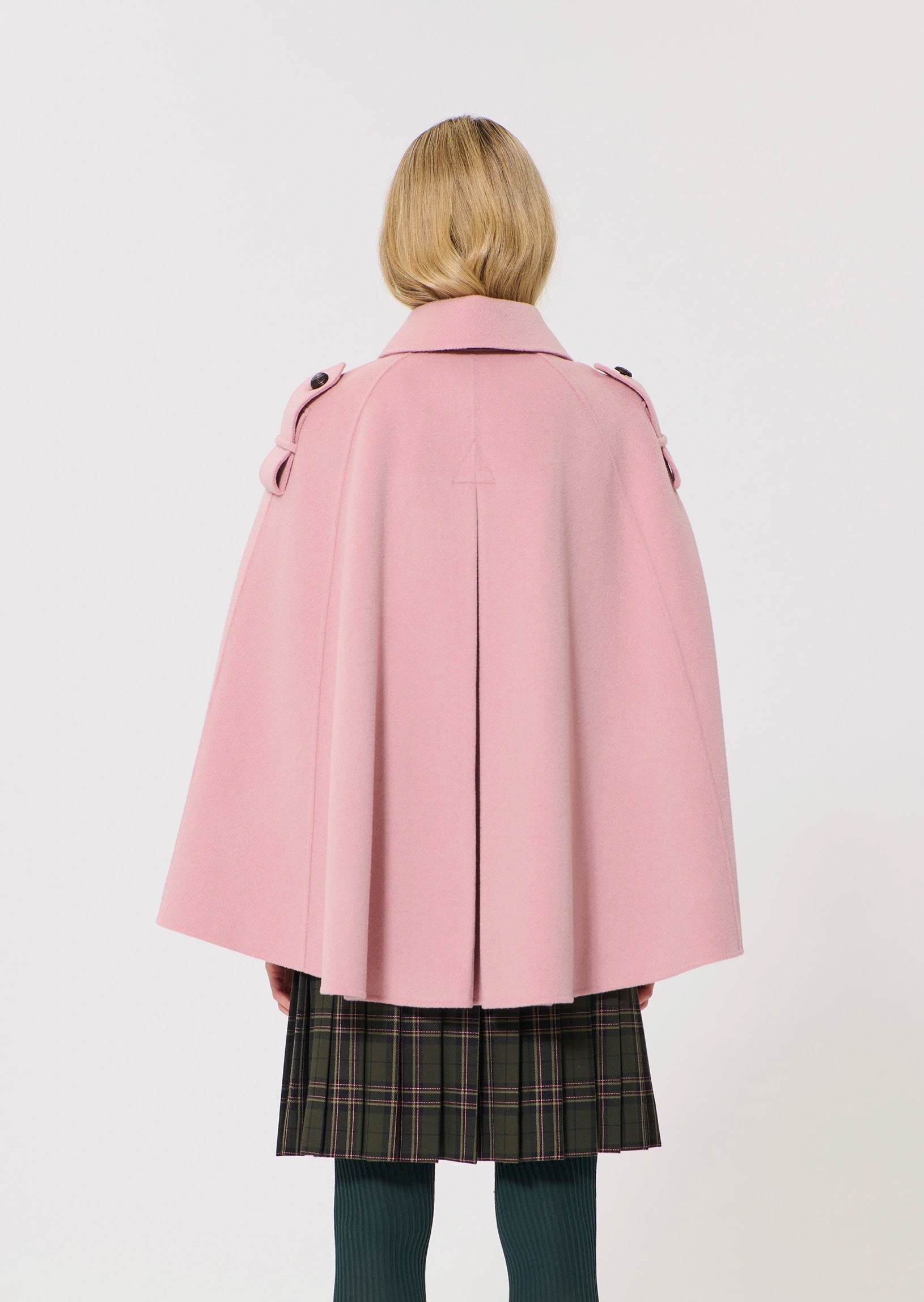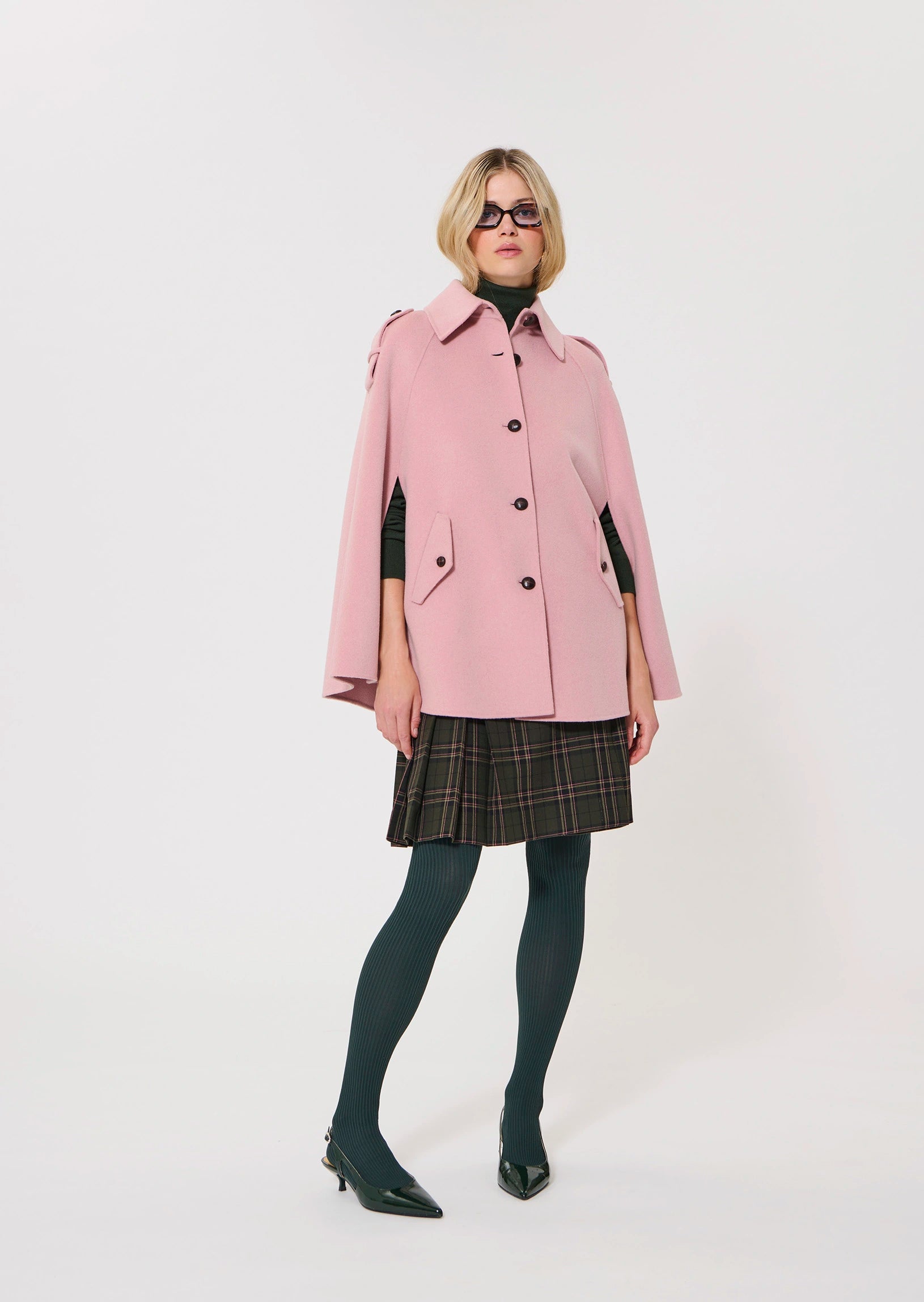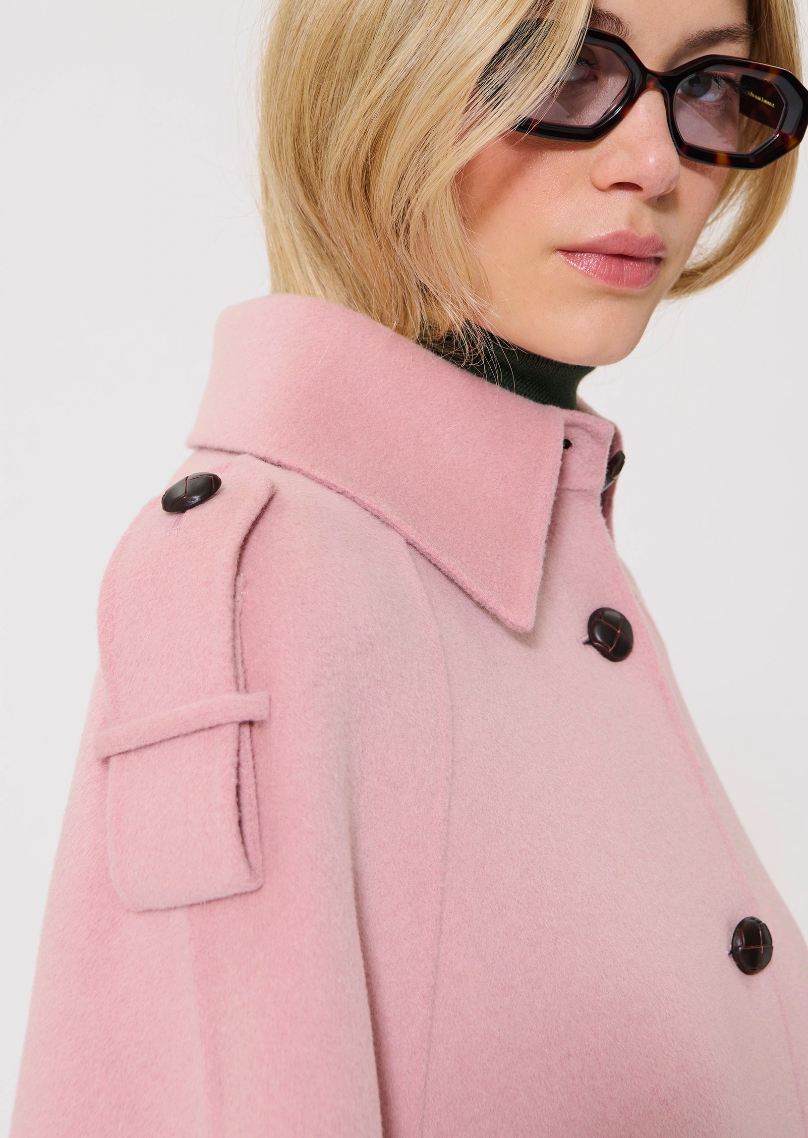 Ce manteau cape en laine double face couleur rose blush possède un col classique, des pattes de boutonnage aux épaules et deux fentes aux côtés pour pouvoir y passer les bras. Il se ferme au-devant par des boutons, que l'on retrouve également sur les poches à rabats aux côtés.