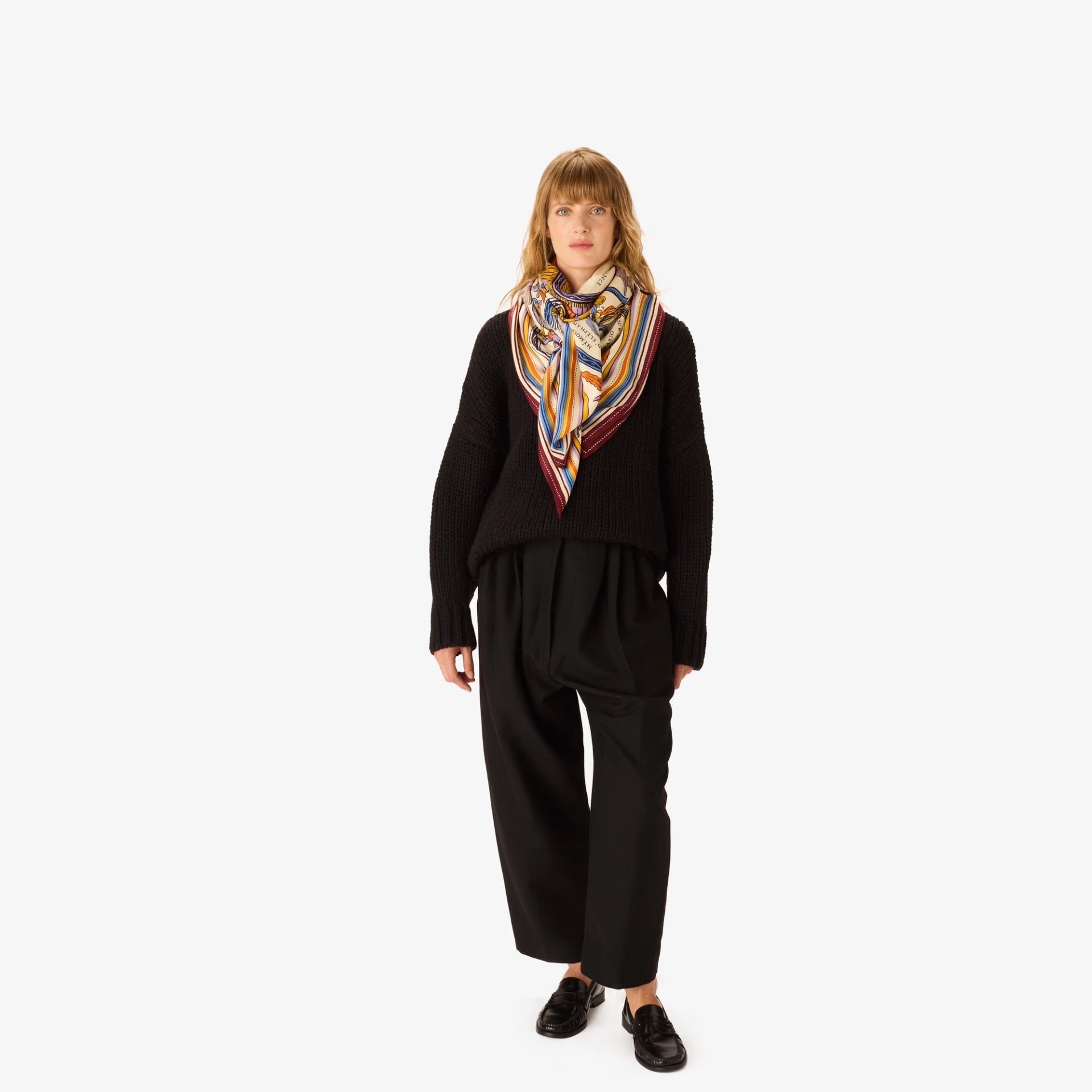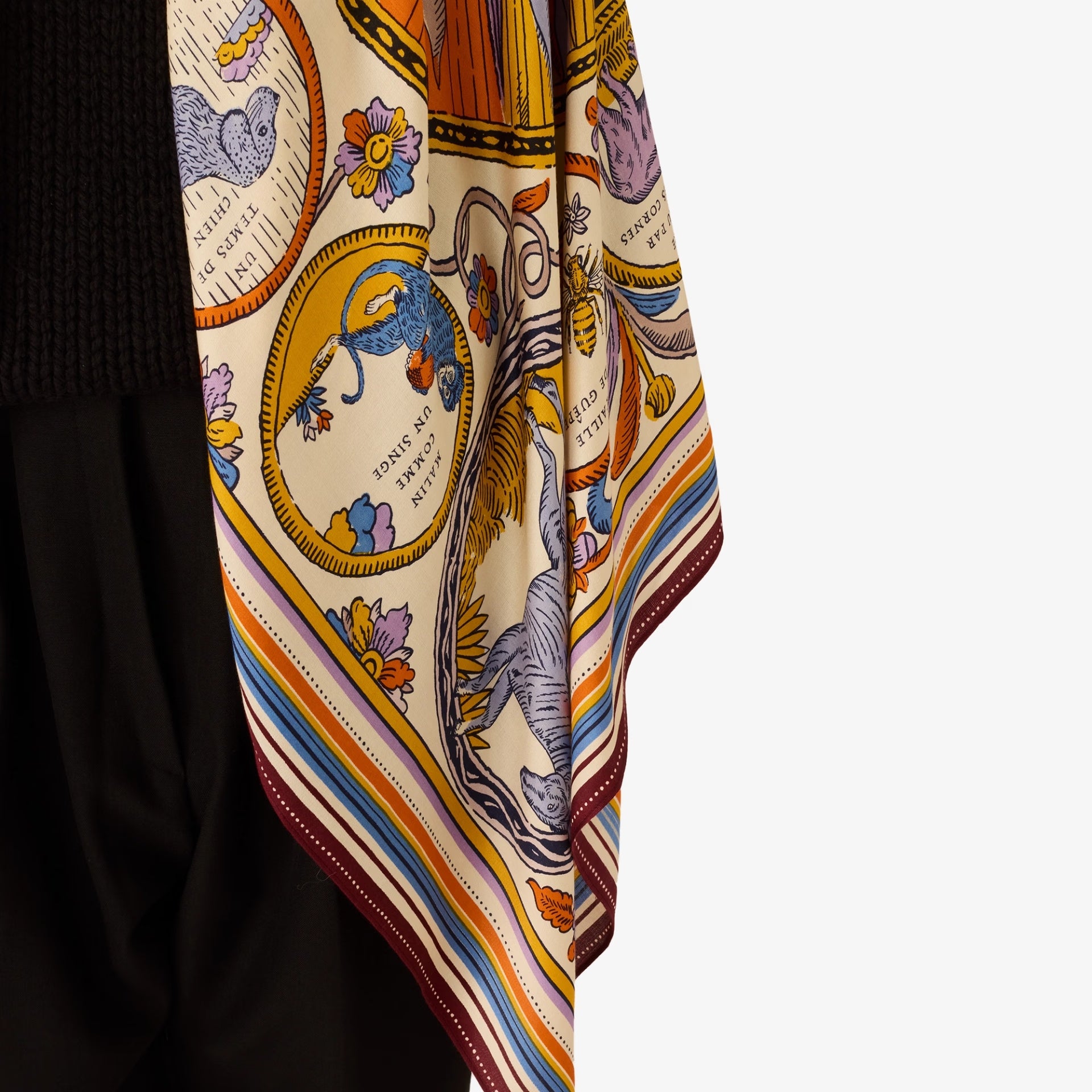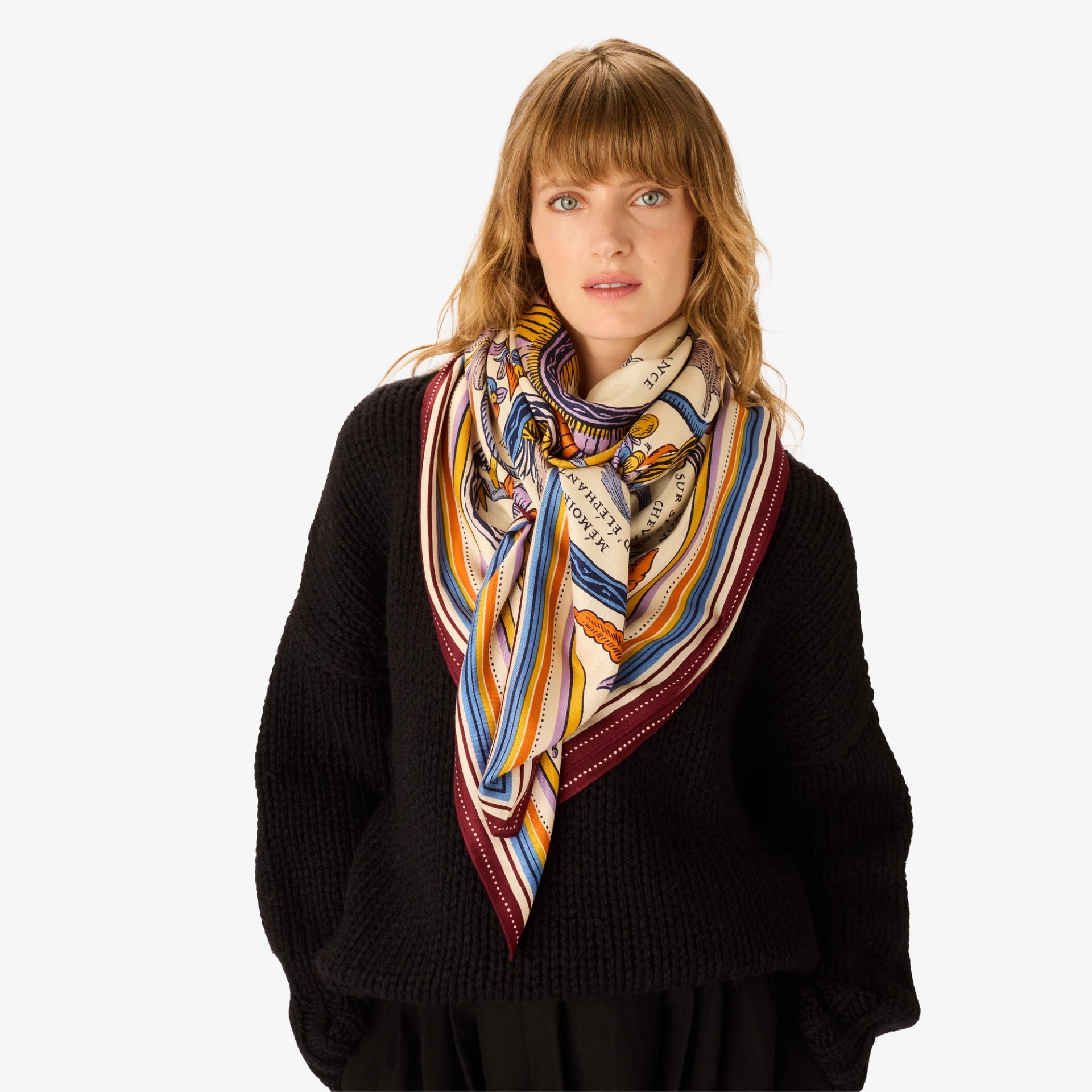 Présent chez Inoui Editions depuis plusieurs saisons, le carré est maintenant un incontournable de nos collections et se décline en plusieurs tailles suivant les designs. Il se détourne vers de multiples usages, faisant se rencontrer ainsi l'art et le vêtement et devenant une pièce ludique et polyvalente de la tenue. Le carré 130x130 se porte autour du cou ou se noue en jupe ou en top cache-coeur.
