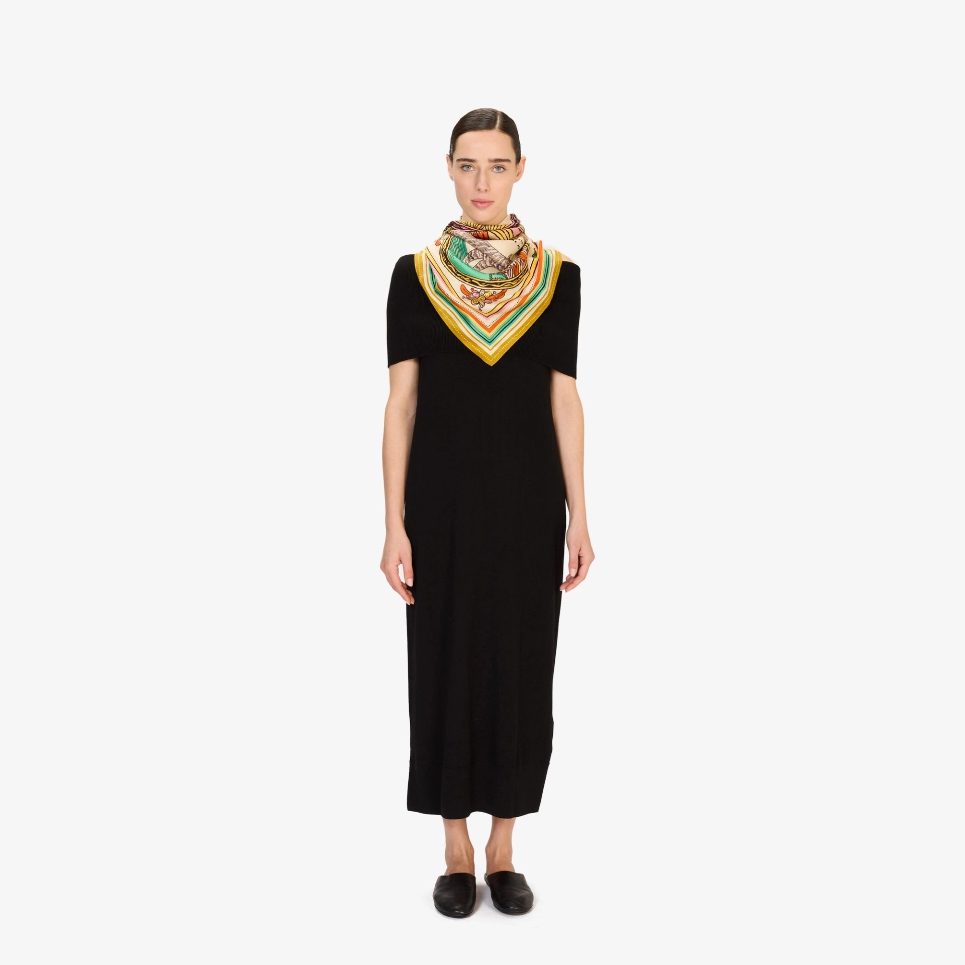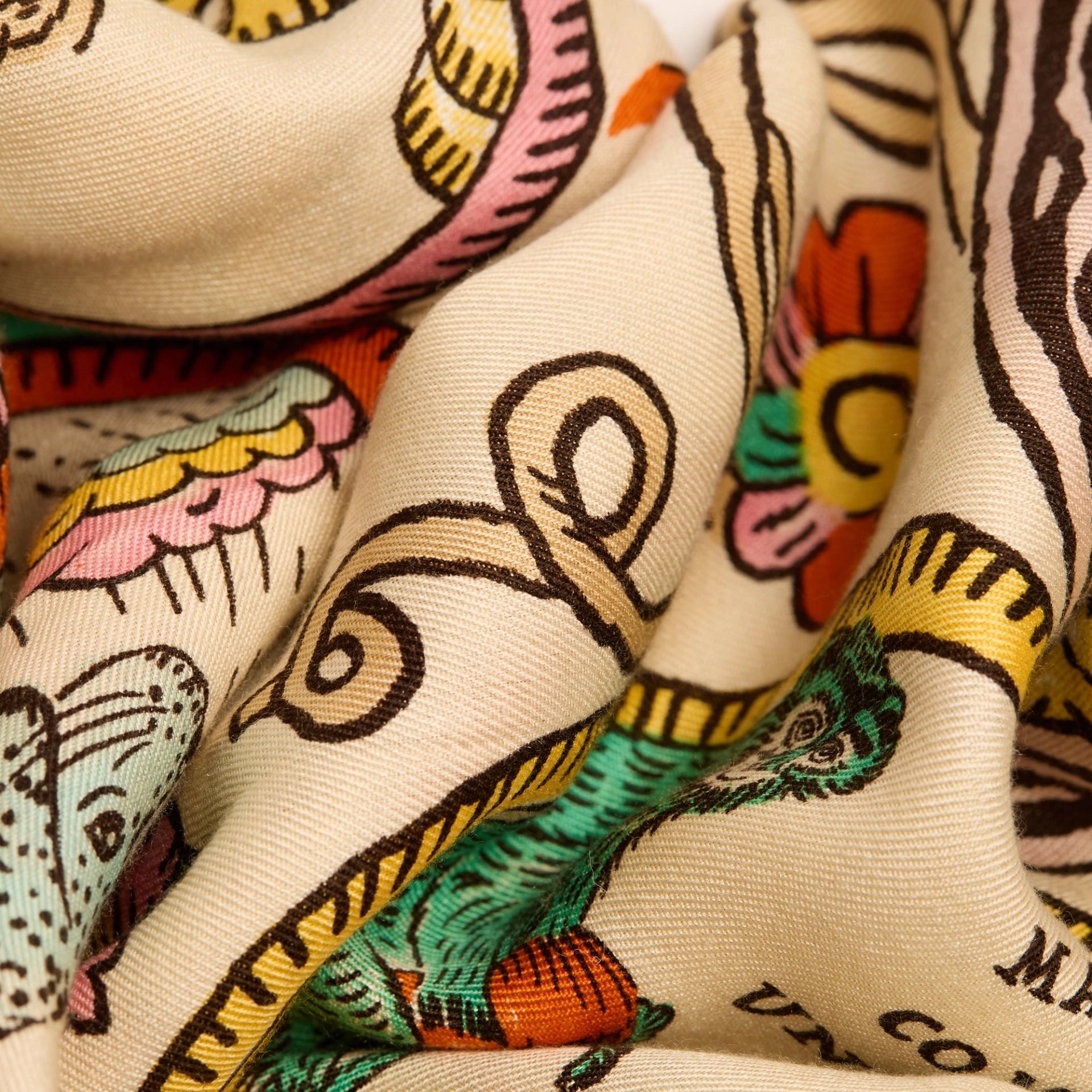 Présent chez Inoui Editions depuis plusieurs saisons, le carré est maintenant un incontournable de nos collections et se décline en plusieurs tailles suivant les designs. Il se détourne vers de multiples usages, faisant se rencontrer ainsi l'art et le vêtement et devenant une pièce ludique et polyvalente de la tenue. Le carré 130x130 se porte autour du cou ou se noue en jupe ou en top cache-coeur.