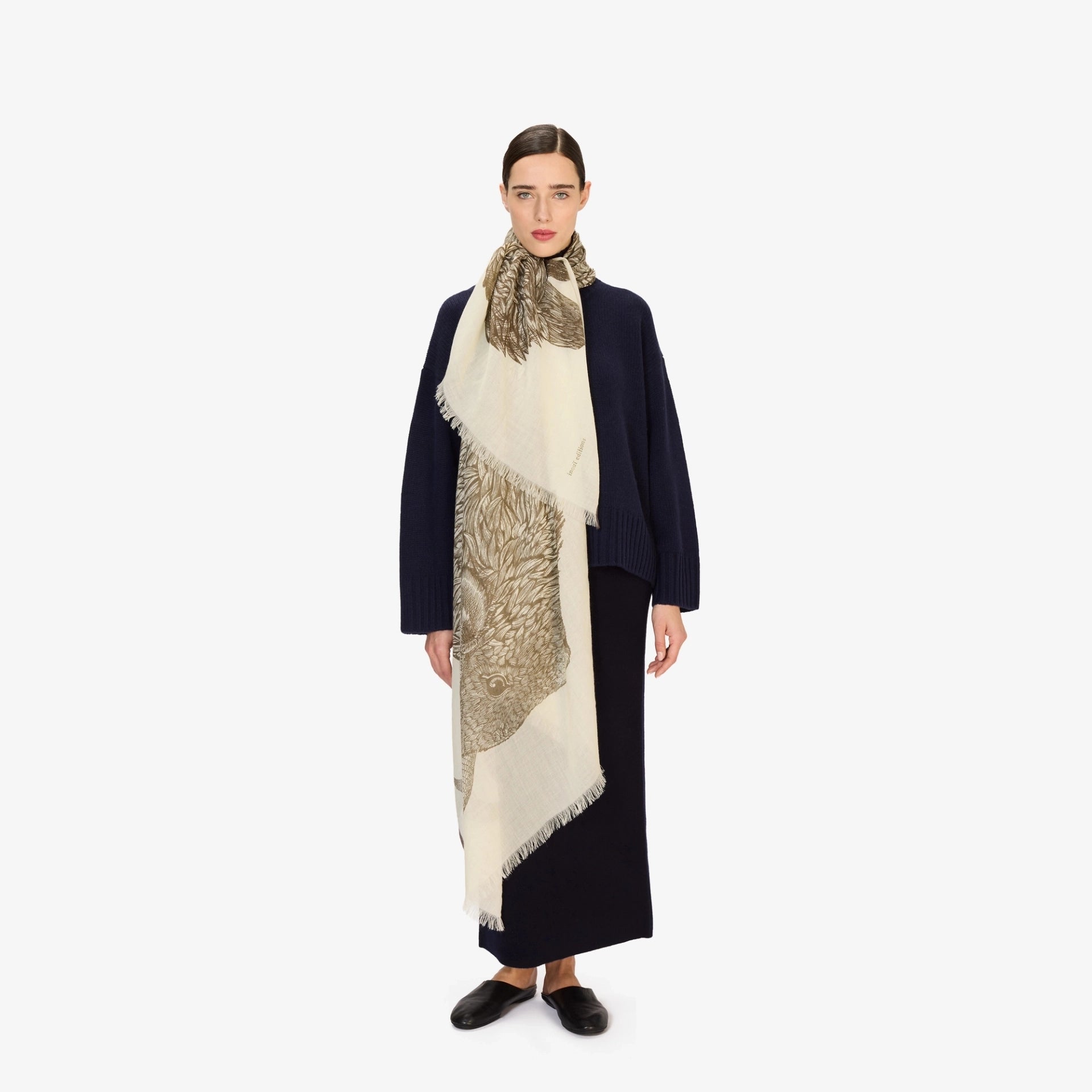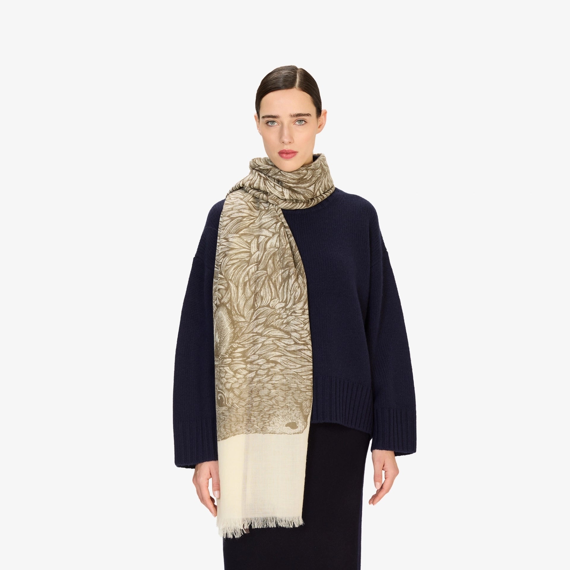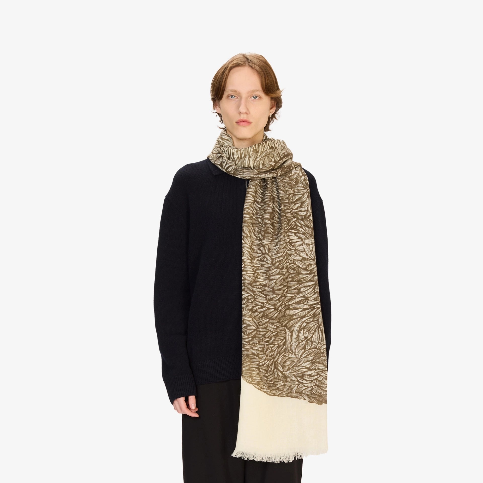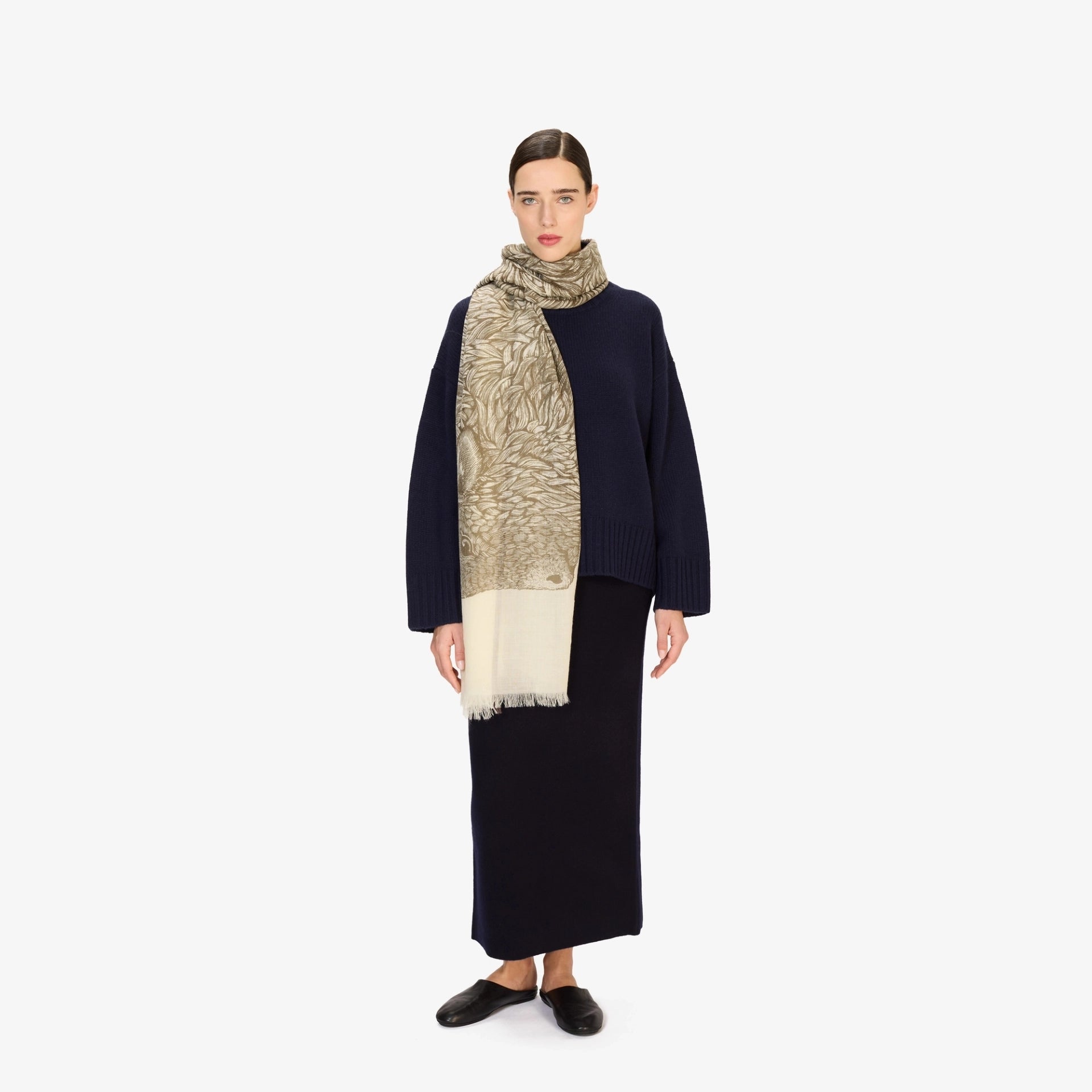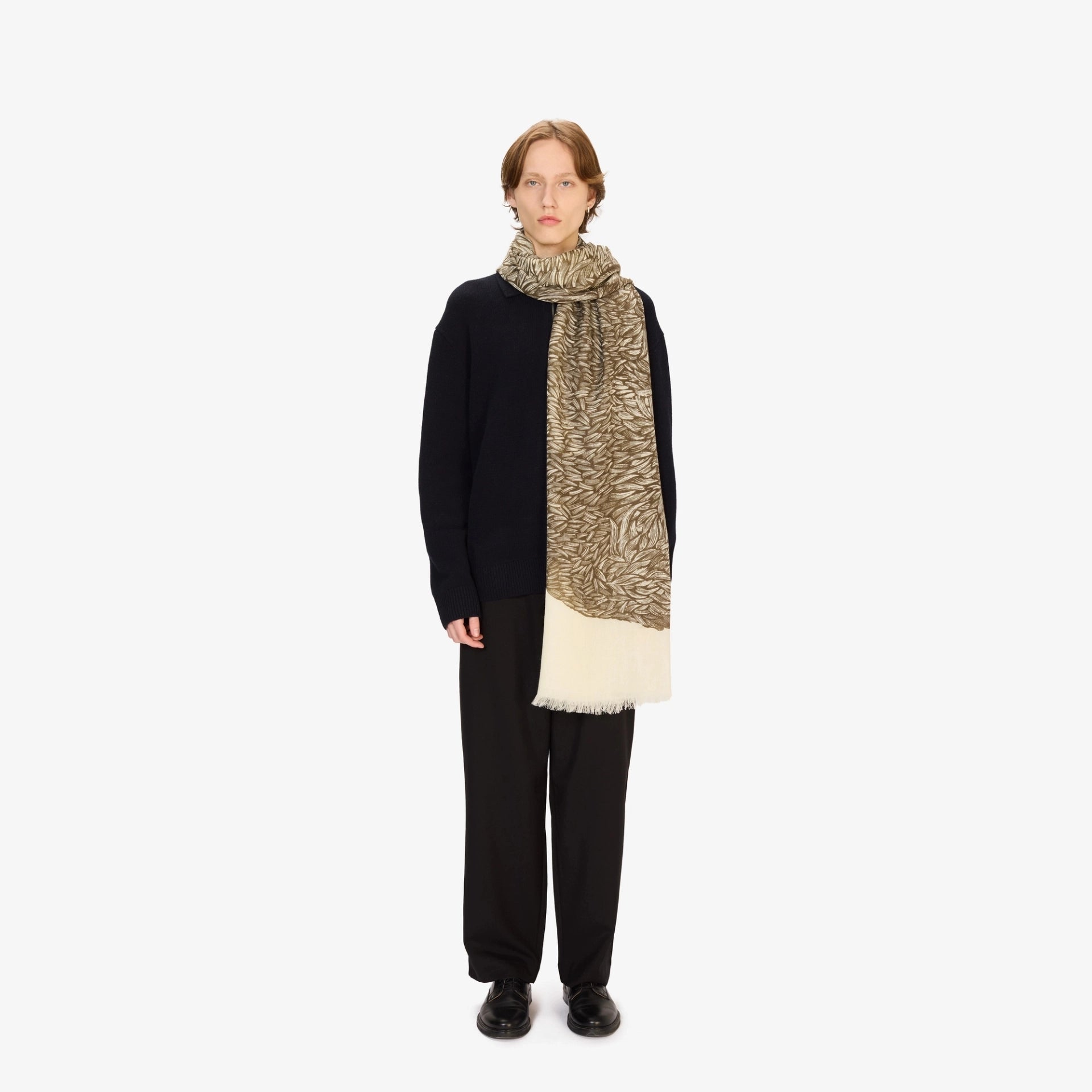 Cette ligne d'écharpes imprimées à la main se décline en plusieurs tailles suivant les designs. Douce et idéale pour l'hiver, la laine a la particularité d'être lavable.