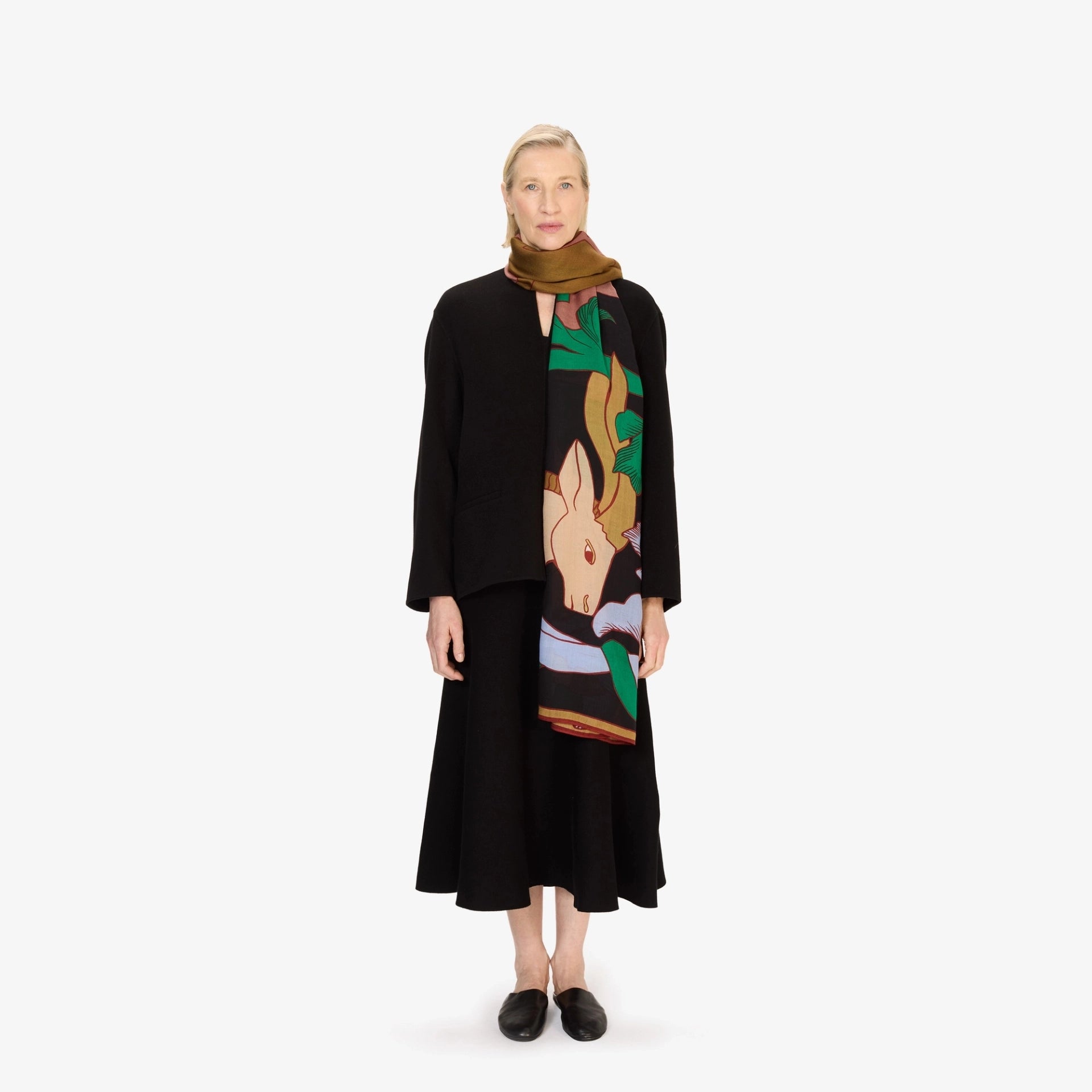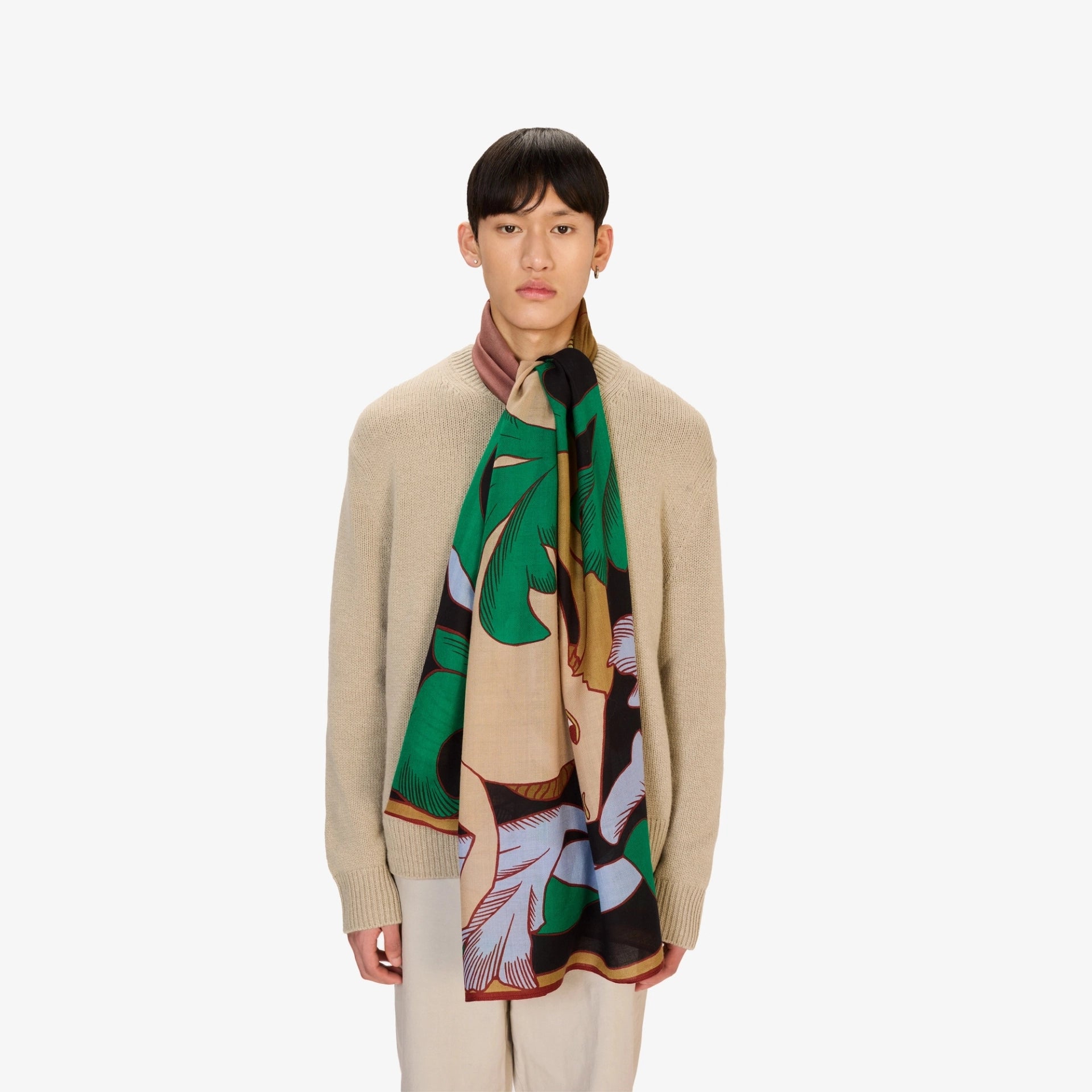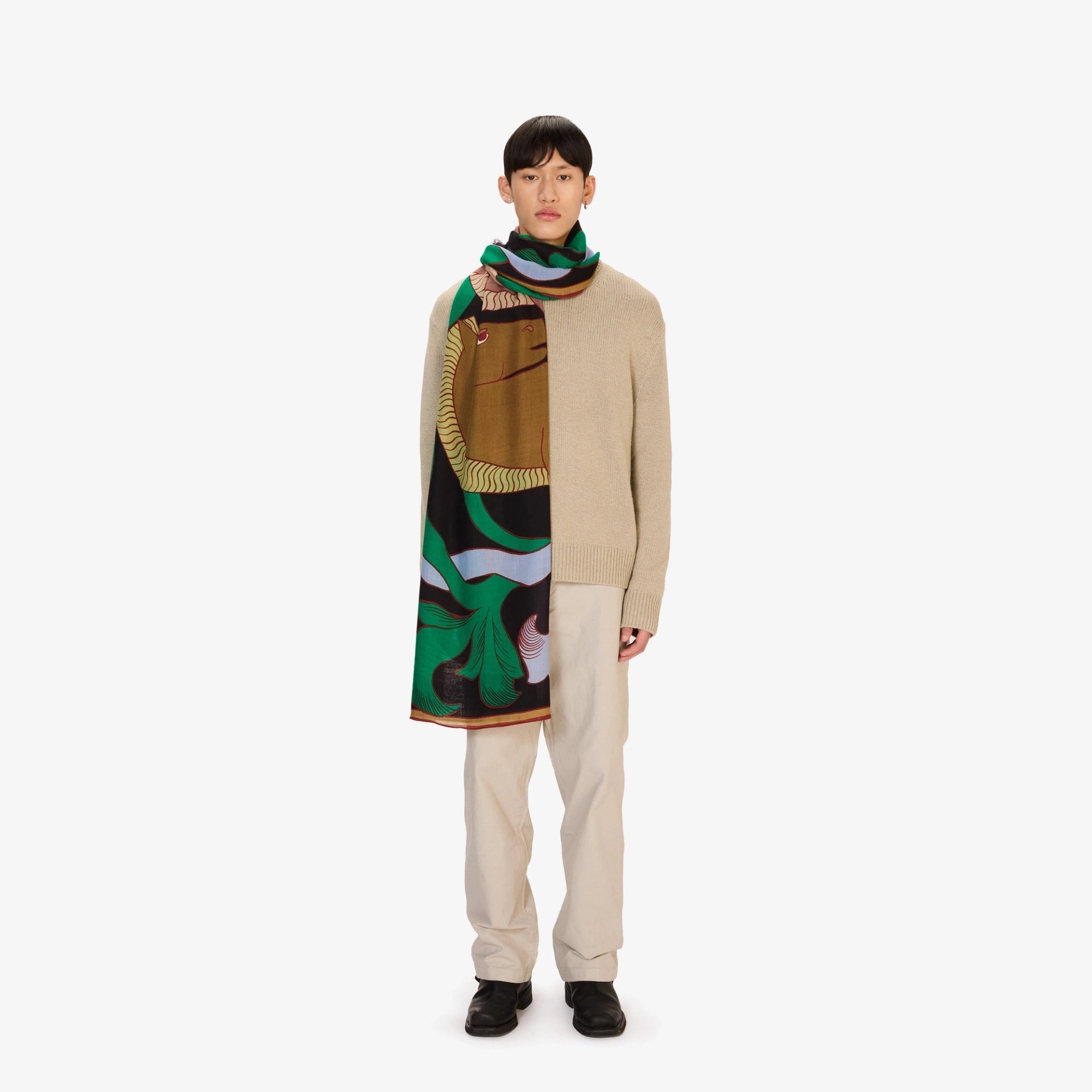 Cette ligne d'écharpes imprimées à la main se décline en plusieurs tailles suivant les designs. Douce et idéale pour l'hiver, la laine a la particularité d'être lavable.