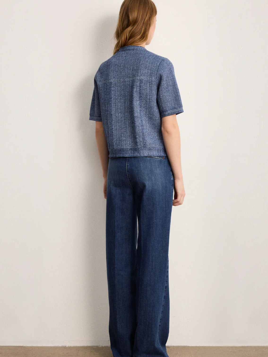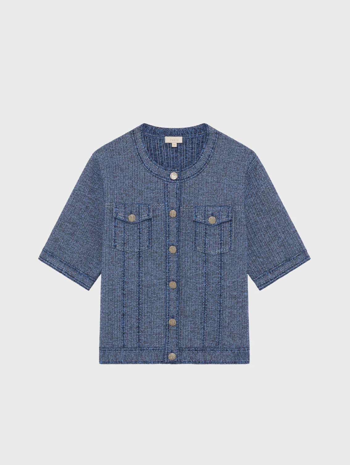 Le gilet en maille Lisa joue à la fois le côté tweed et denim. Il est réhaussé de rayures argentées, et orné de boutons martelés et de poches à rabat dans un esprit couture. Une pièce idéale à mixer avec un pantalon blanc ou une jupe en jean.