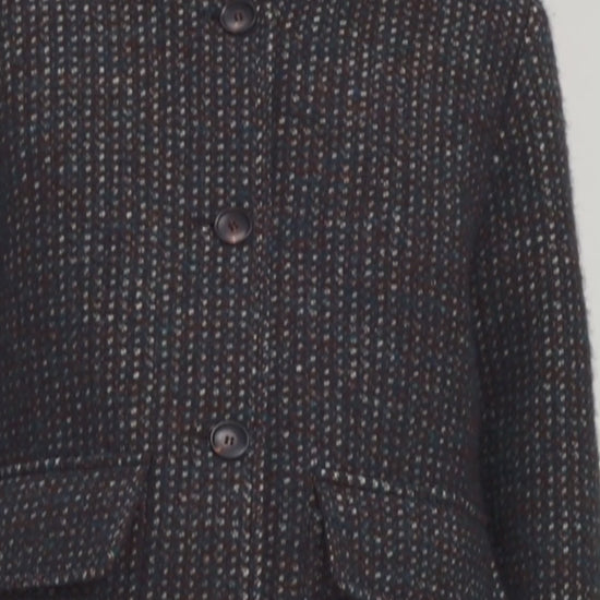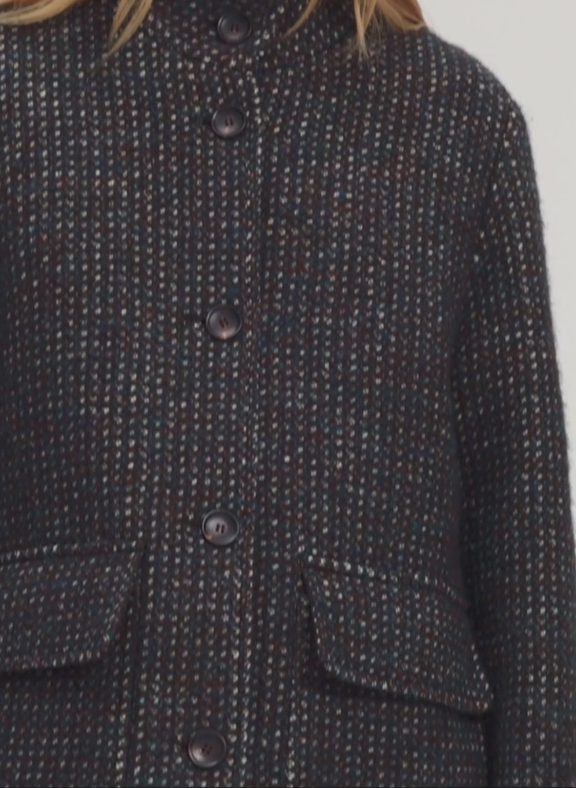 Manteau ample à col montant et volume rond. Confectionné en laine mélangée esprit bouclette dans des tons de marron, vert et écru.