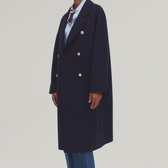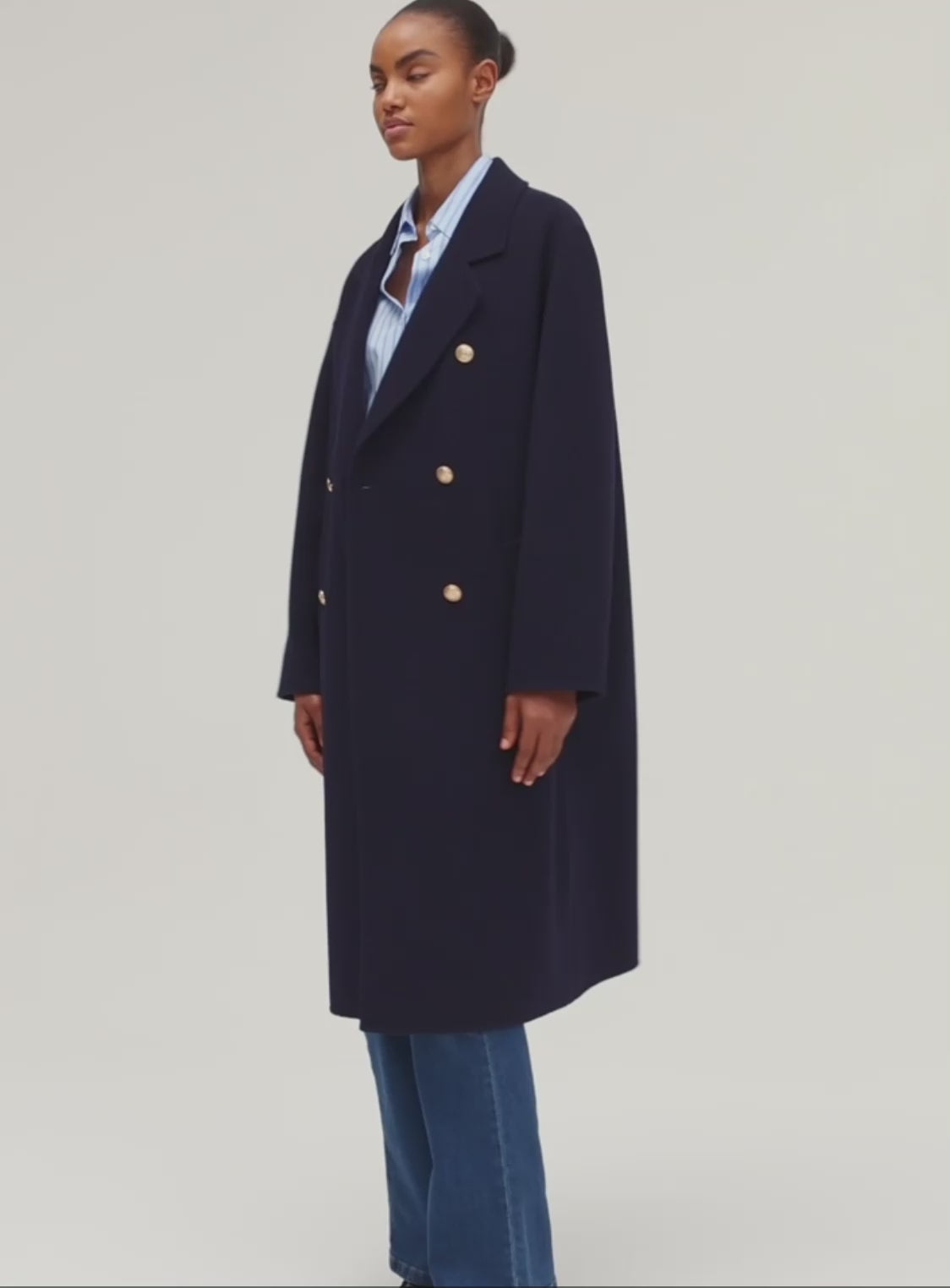 Sophistication contemporaine pour ce manteau long et oversize orné de boutons dorés gravés. Confectionné en 100% laine fine double face, il se portera aussi bien avec des tenues classiques que tendance.