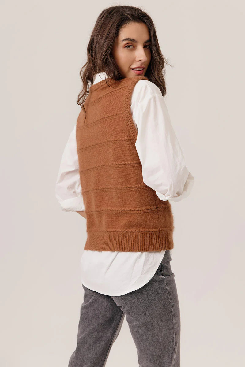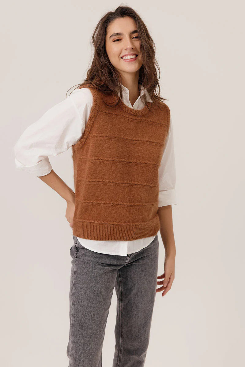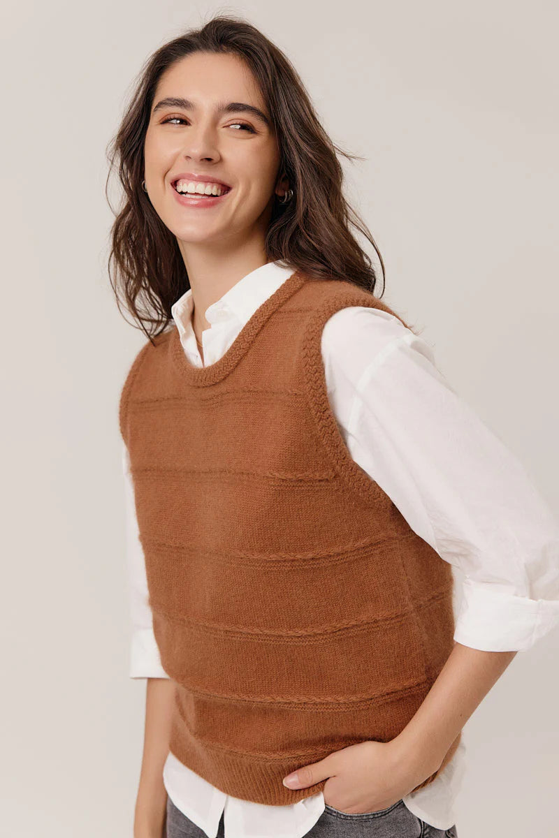 Débardeur col montant, maille côtelée, coupe ajustée. À porter seul ou en superposition.