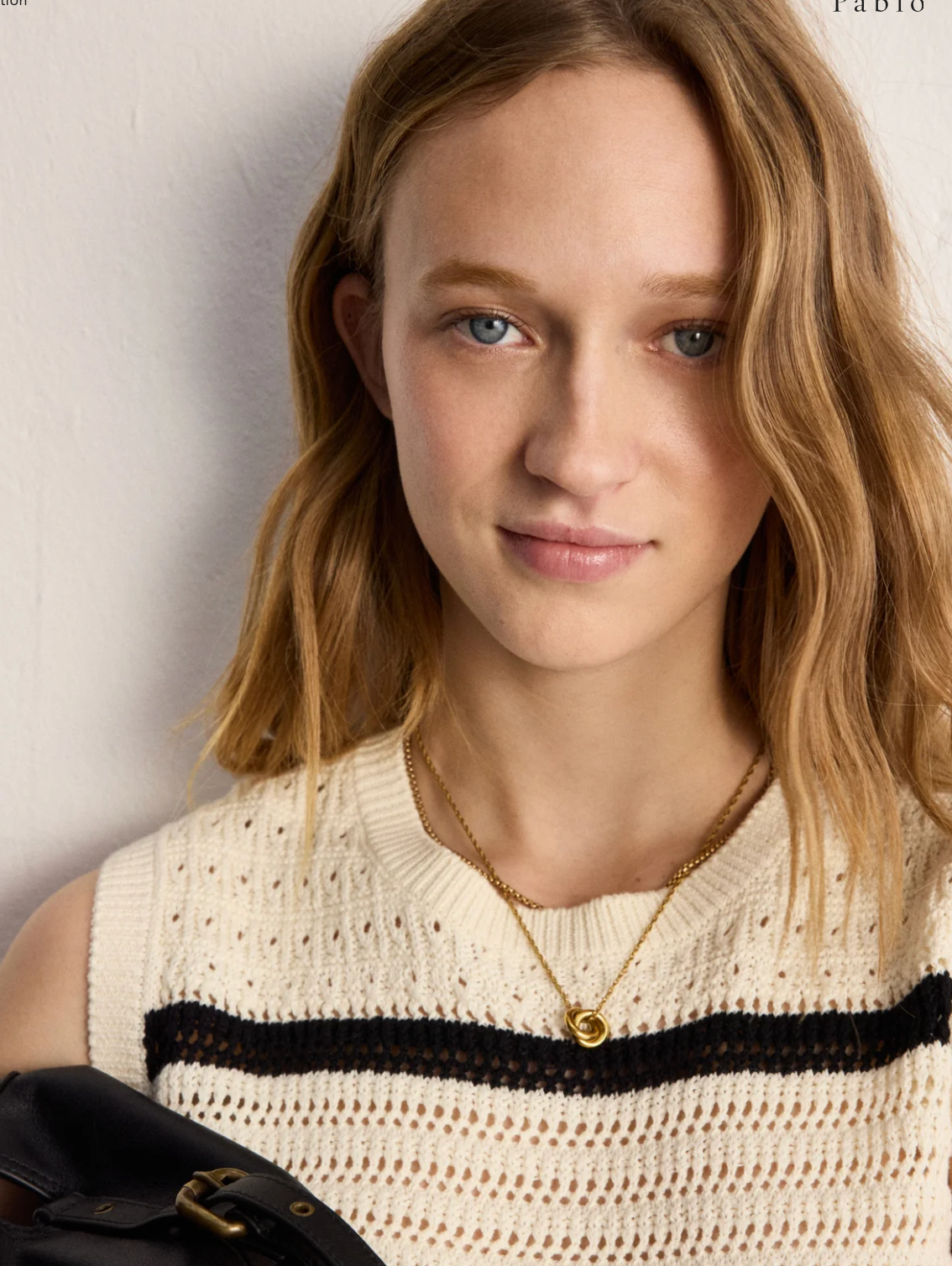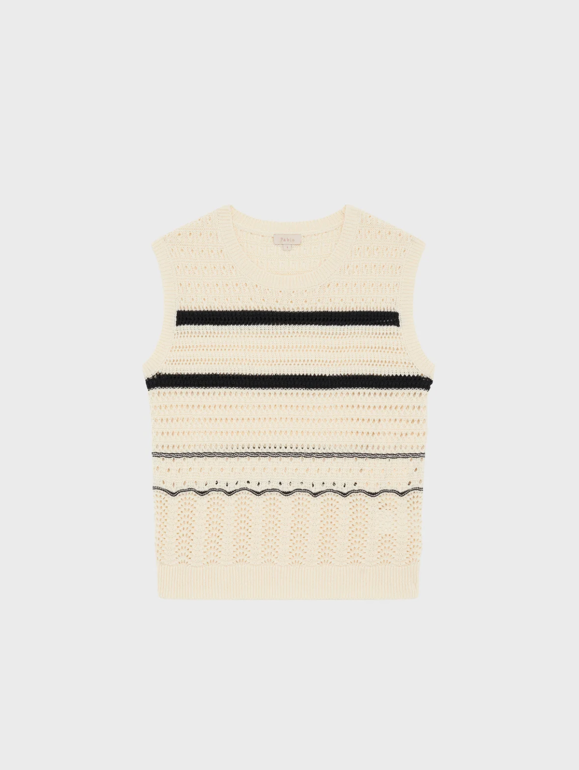 Ce top en maille ajourée écrue est rehaussée de rayures noires dans un esprit rétro. Son jeu de points alterne reliefs et transparence pour un effet graphique et raffiné. Il se portera seul en journée, ou avec un blazer pour le soir. Il est confectionné en 100% coton.