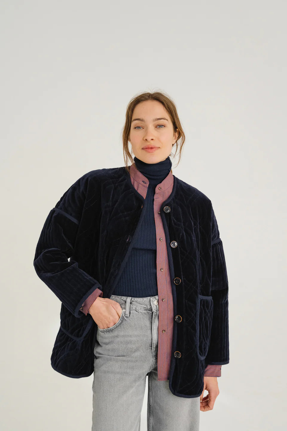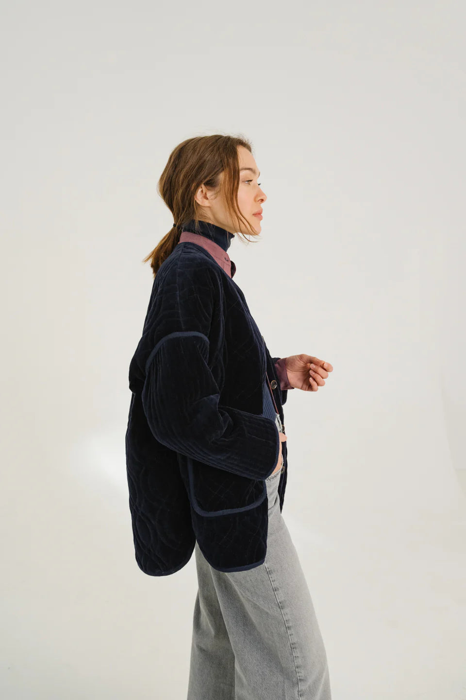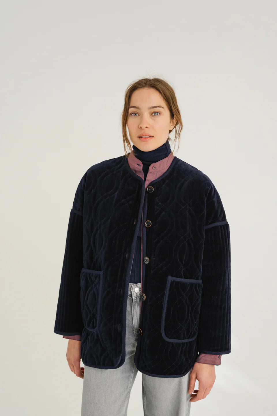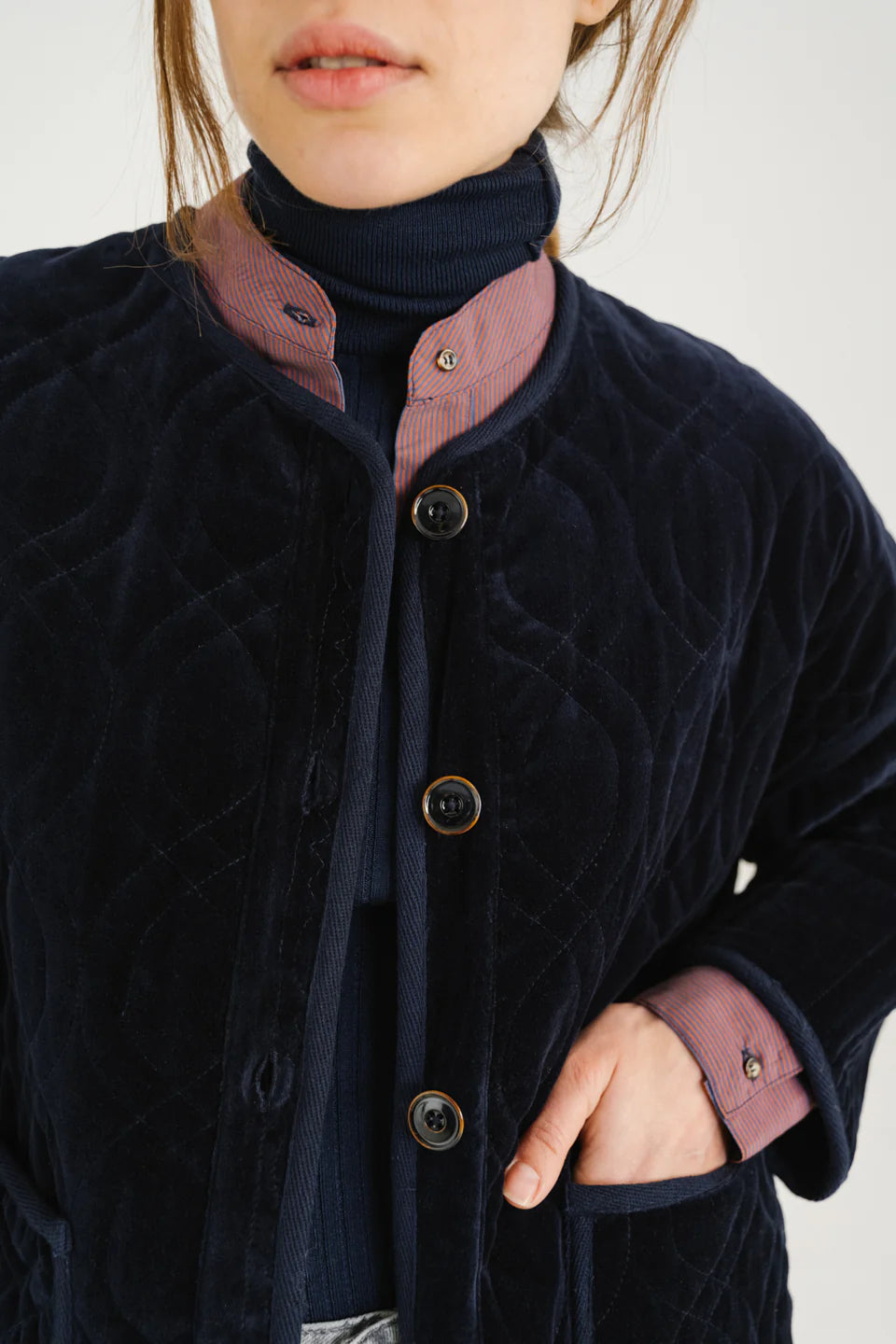 Veste mi-longue, en velours ras matelassé navy, emmanchure basse, deux poche plaquée devant. Boutons apparent, coupe oversize, sans col.