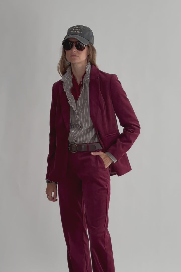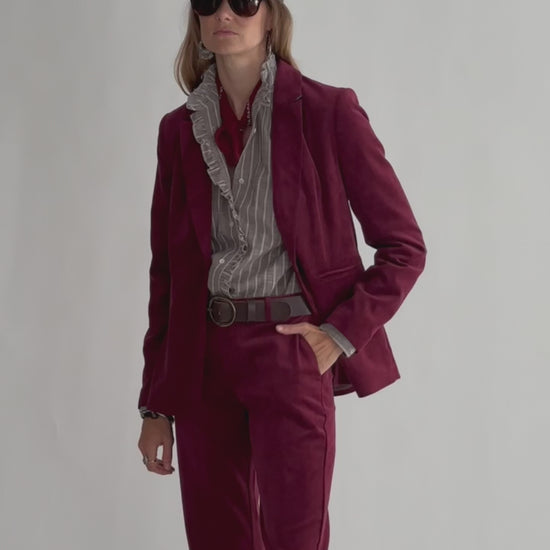 La veste de tailleur en VINO CABERNET est un choix parfait pour celles qui recherchent une pièce à la fois élégante et décontractée. Sa couleur bordeaux profonde évoque des nuances de vin, apportant une touche de sophistication à n'importe quelle tenue.