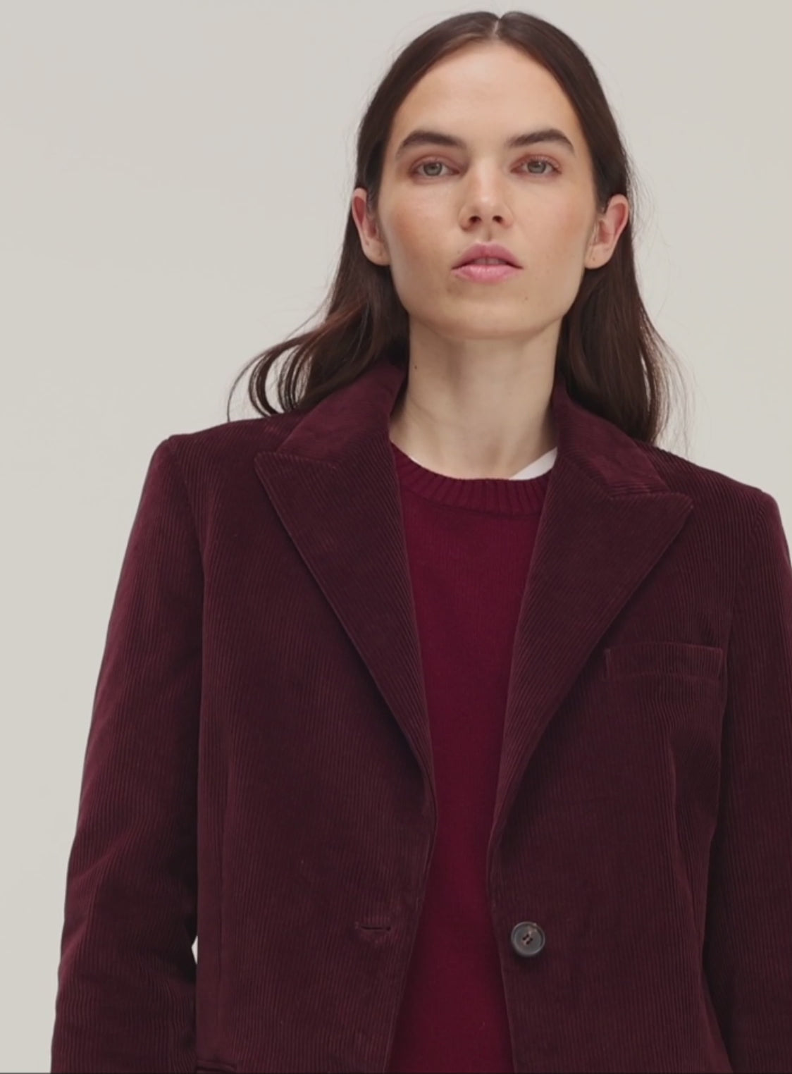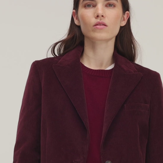 Esprit casual chic pour cette veste bordeaux en velours côtelé. Peut se porter avec le pantalon assorti. Pièce intemporelle.